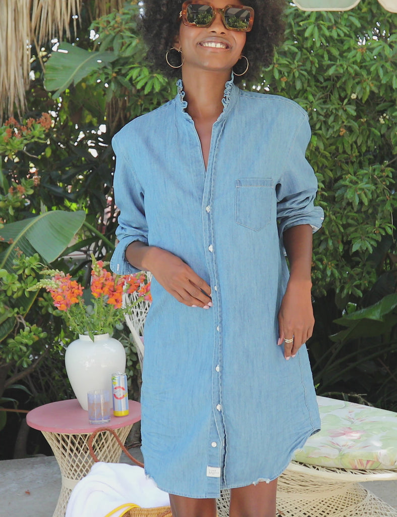 Our #1 selling shirtdress, dressed up with a fresh, feminine ruffle collar. Designed for a relaxed fit in a mini length.