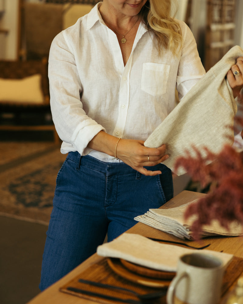 JOHANNA AND FIONA: We both love relaxed California casual style for interiors, which is very much reflected in our personal style! Our Saffron + Poe uniform usually consists of casual but refined jeans and button-ups—we especially love Barry and a denim Kinsale because they're simple yet elevated pieces that feel timeless and classic.