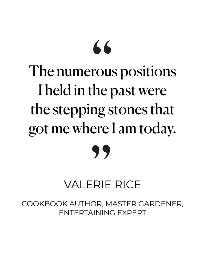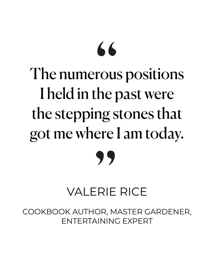 VALERIE: First and foremost, my job is being a mom. My professional ride has been more of a journey than a mapped-out plan—work projects started small and evolved as I learned and accomplished more. I started writing down recipes and taking photos of what I was cooking because people asked me to. I became a master gardener to grow better-tasting vegetables. Once my garden started expanding, people asked me to help them design theirs. As my daughters have gotten older, I’ve been able to explore new career challenges. You must be willing to try different things until you find the one that works best. The numerous positions I held in the past were the stepping stones that got me where I am today.