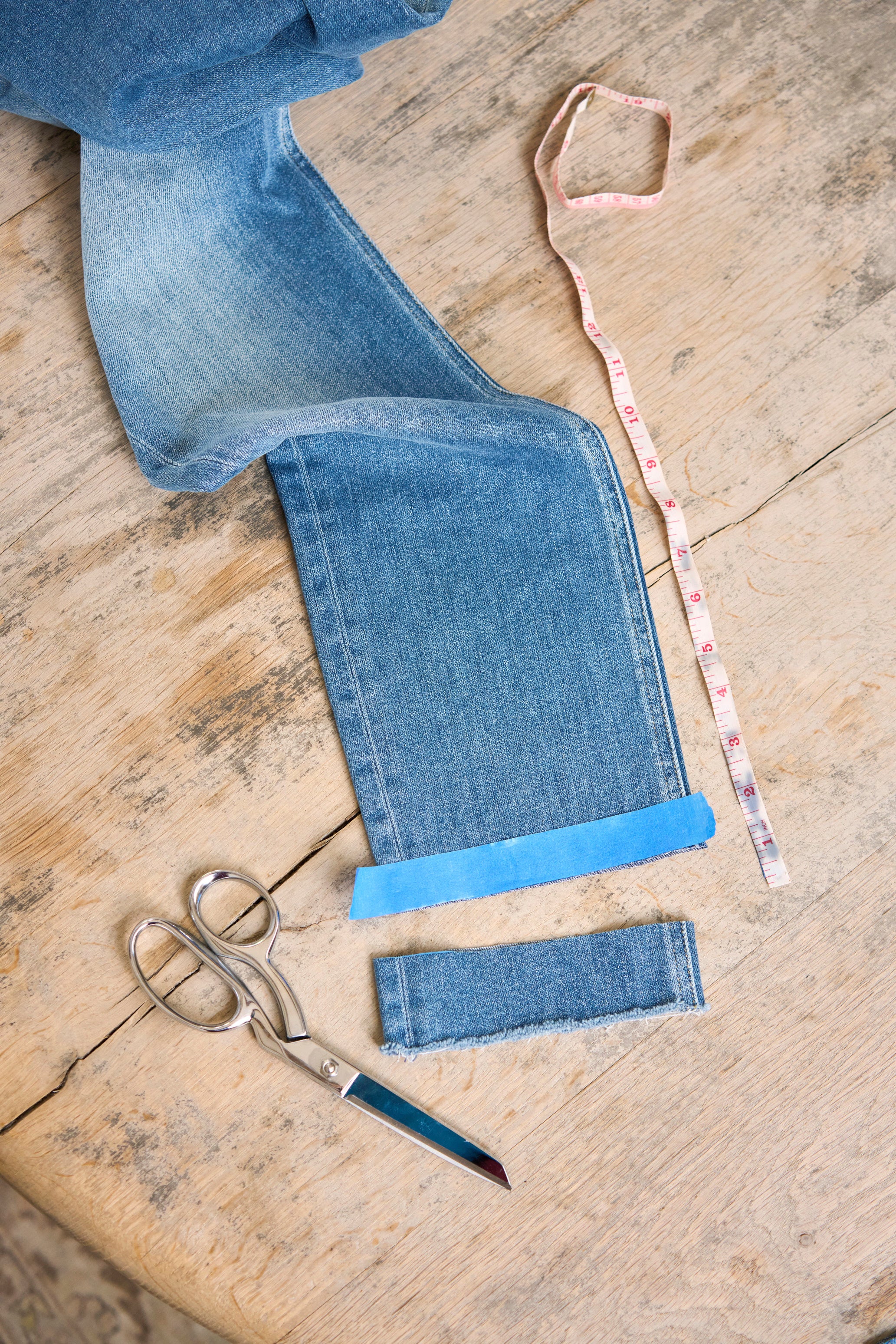 - Carefully cut the pant, using the bottom of the tape as your guide.
