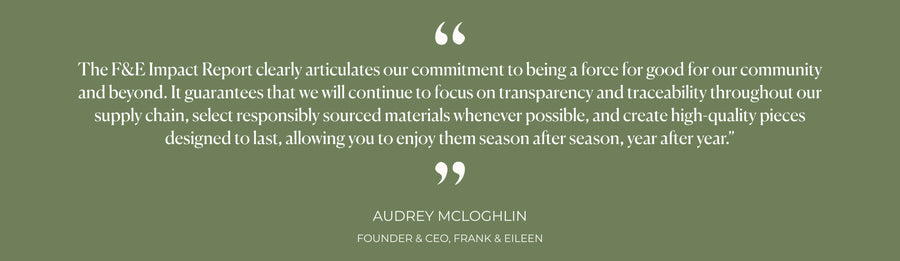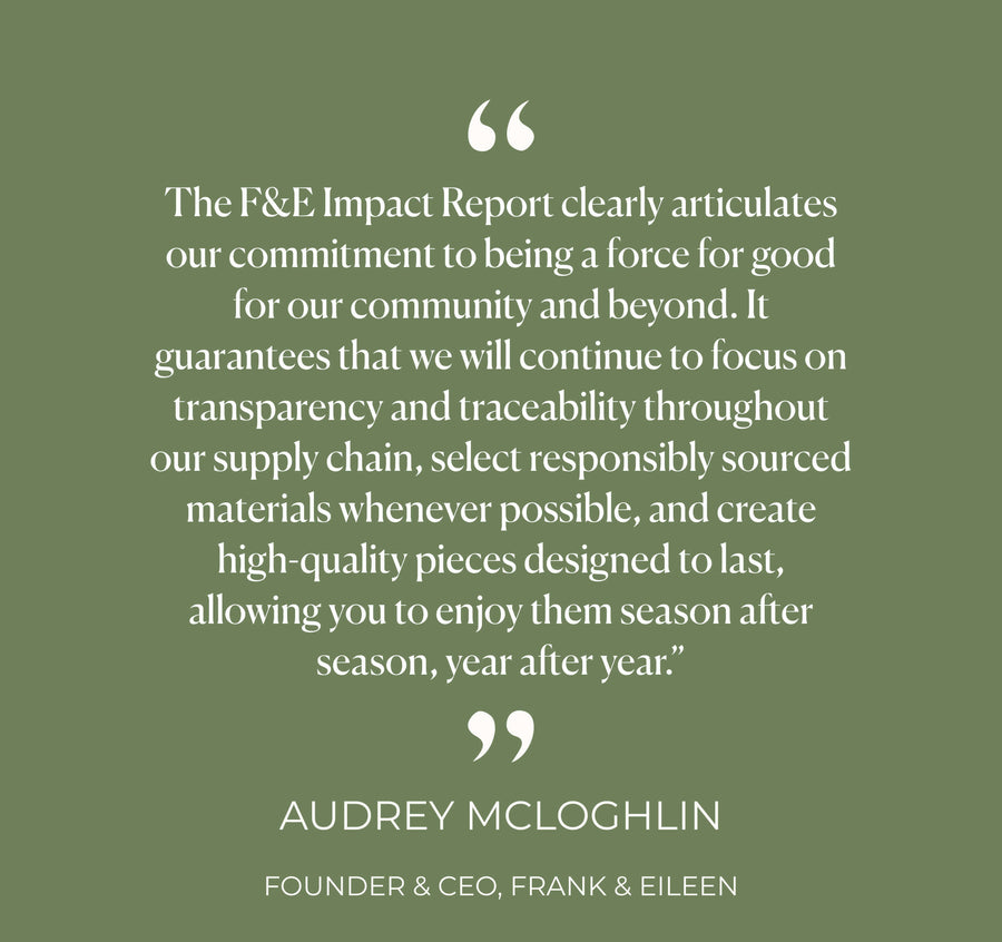 At Frank & Eileen, we believe in building wardrobes—and our business—with integrity. Since our founding in 2009, F&E’s commitment to being better has stretched far beyond clothing, touching every area of the brand. Following our 2020 B Corp certification and 2024 re-certification, we decided to take that commitment to sustainability even further and release our first impact report to share our initiatives and progress with you.