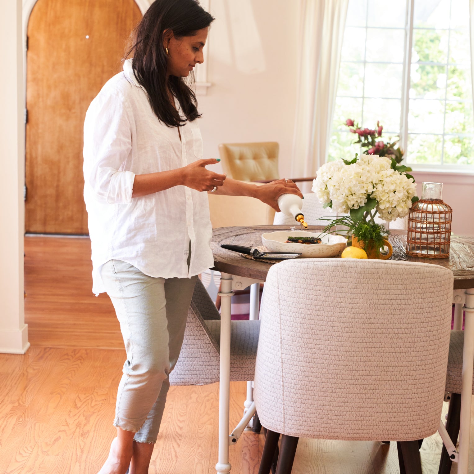 Aishwarya is photographed wearing Eileen Classic Linen in White and Wicklow in Sage.