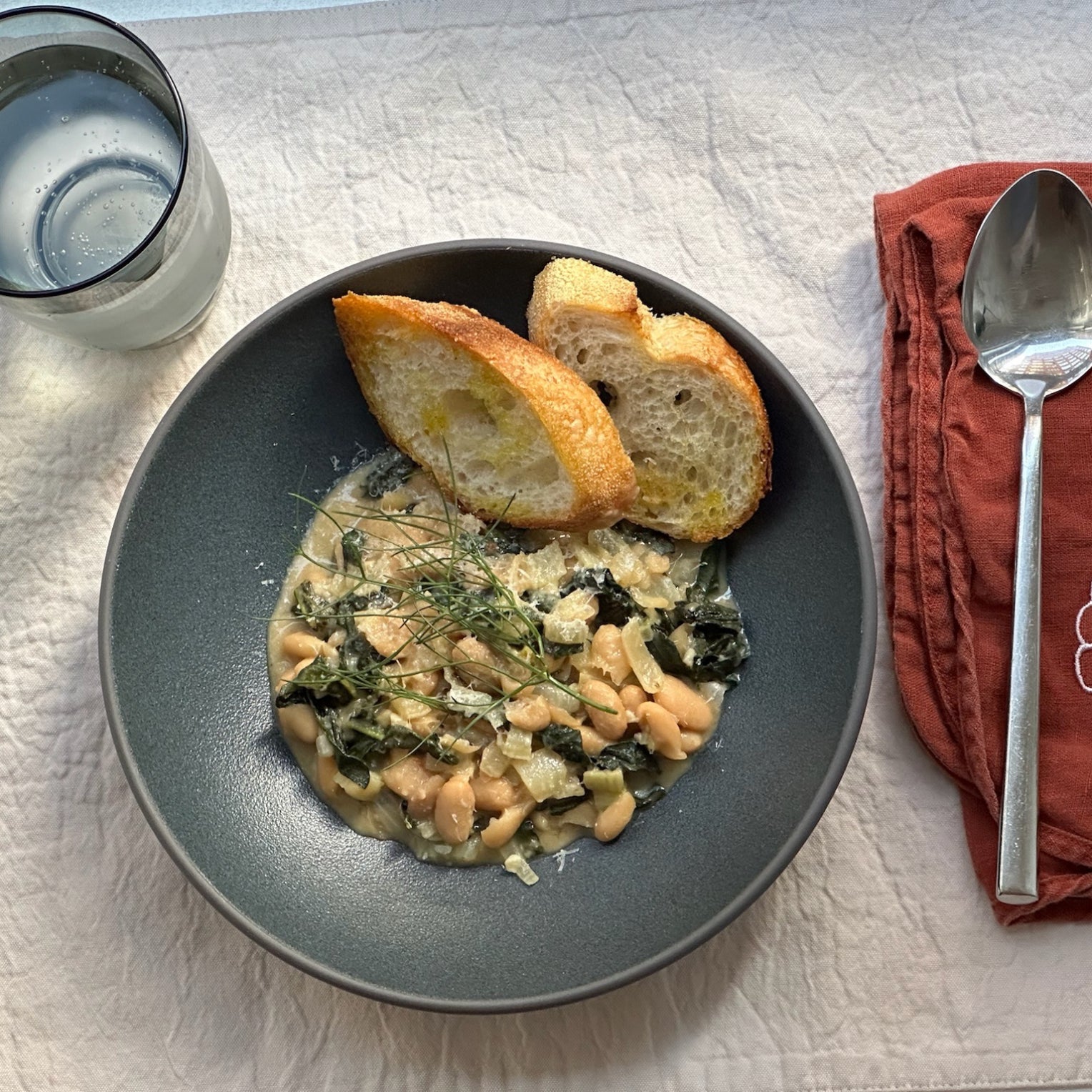 BRAISED WHITE BEANS AND GREENS WITH PARMESAN