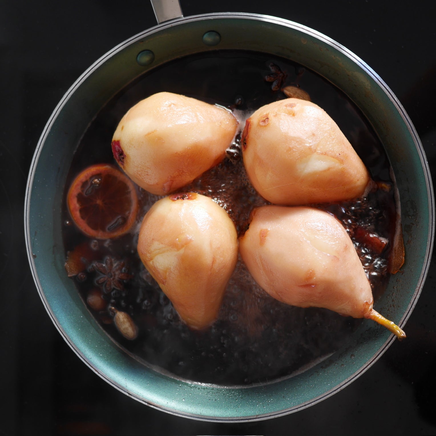 - Once hot, begin to peel your pears and submerge them alongside one another in the hot wine. Turn pears every 5-10 minutes so that every side is coated and cook for 20-25 minutes. If the pears still seem pale, keep submerged after removing from heat and continue turning for as long as you'd like