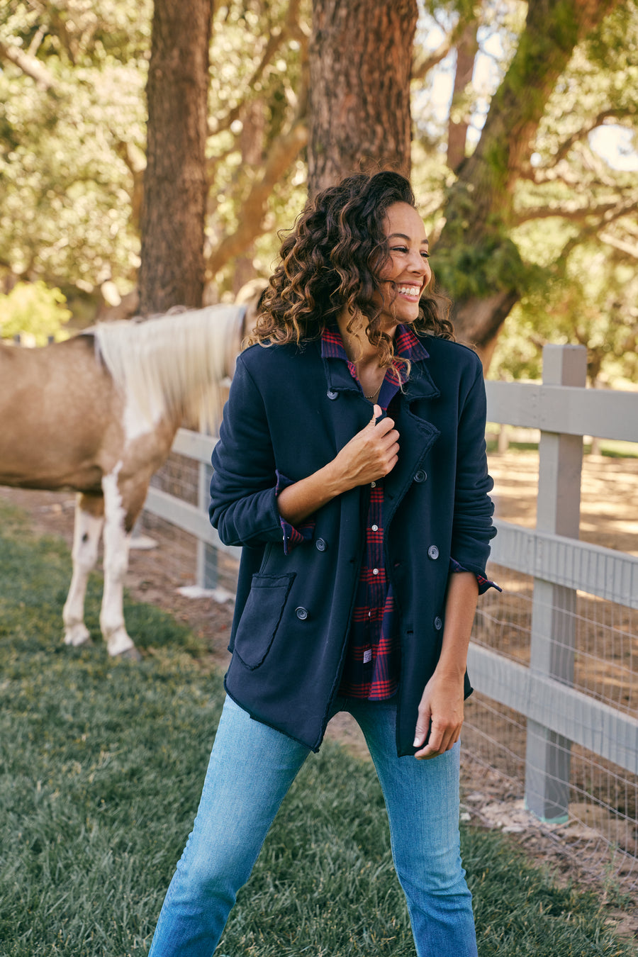 Meet Belfast, our English-peacoat-meets-California-cool jacket designed to toss over a tee and go! Luxurious horn buttons, scrunchable sleeves, a stretchy fit, and statement collar add a pop of California cool to this year-round piece.
