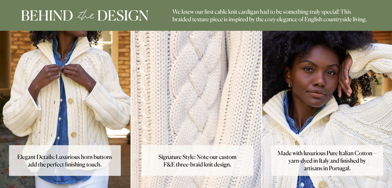 Introducing a mini version of the timeless, classic Cotswolds cardigan everyone loves! This cropped cable knit cardigan in luxuriously soft Pure Italian Cotton has all the signatures of the original—richly textured braided patterns, elegant horn buttons, and an exaggerated cozy collar–with a versatile cropped fit that shows off your layers!